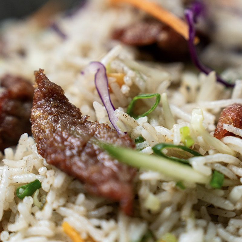 Wok fried rice, mixed veg, beef strips, soy sauce & seasoning